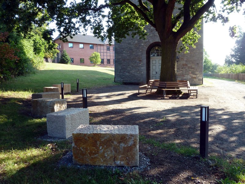 Die Gestaltung des Platzes vor der Kirche schreitet voran und lädt Gottesdienst- und Kirchenbesucher, Spaziergänger und Radfahrer zum Verweilen ein. Neben der Bank um unsere vor 100 Jahren gepflanzte Eiche wurden nun sechs Natursteinquader gesetzt. Gerne kann man auf diesen Kalksteinquadern aus dem Weserbergland etwas ausruhen und den Alltag mit Entschleunigung bereichern.