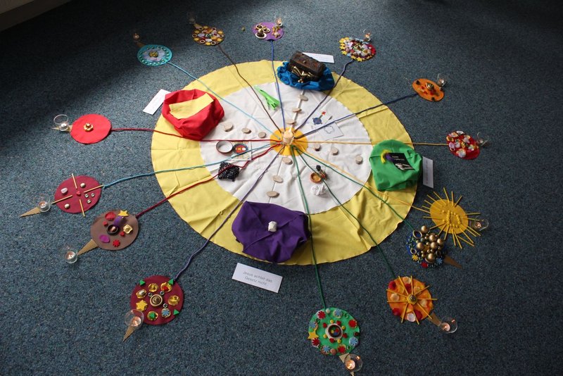 Vier Geschichten von Jesus wurden erinnert und im Bodenbild festgehalten, bevor in die Passions- und Ostergeschichte übergeleitet wurde.
