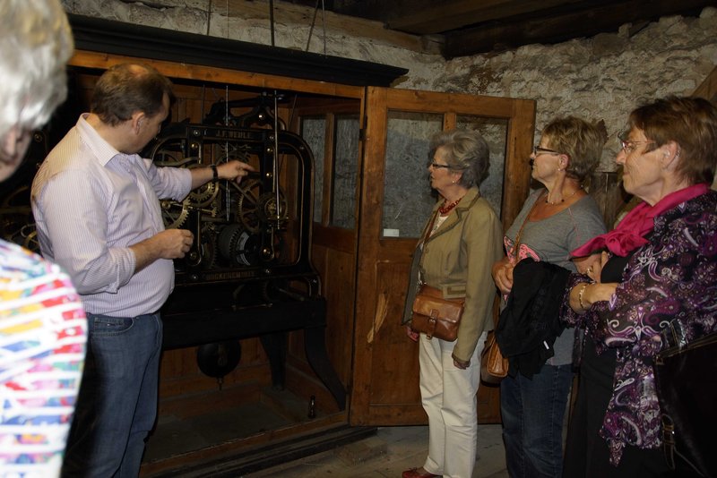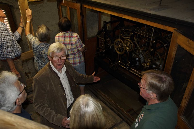 Ein kleines Glöckchen kündigte die Turmbegehungen an. Dieter Kühn und Jens Paret führten abwechselnd kleine Gruppen zu dem mechanischen Uhrwerk im Turm- einem Bereich der Kirche, den nur wenige kennen. Die Uhr wurde besichtigt und erklärt und so manche Anekdote aus vergangenen Zeiten machten jede Führung einzigartig.