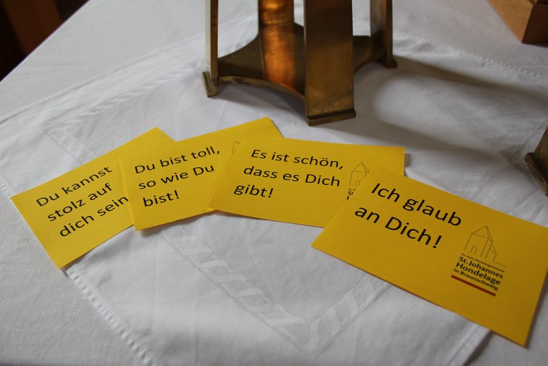 Unter dem Motto des diesjährigen Evangelischen Kirchentages fand am 5. Mai ein Familiengottesdienst in Hondelage statt. Ein Team um Vikar Jonas Görlich und Pfarrer Jens Paret hatte liebevoll einen Gottesdienst für alle Generationen vorbereitet. Wieviel brauche ich wovon? Und wie finde ich das raus? - waren nur einige Fragen, die uns bewegten. Manches, was ich brauche, das muss ich mir auch sagen und schenken lassen - von anderen oder von Gott. Und so durfte sich jede Besucherin/jeder Besucher eine Zusage mit nach Hause nehmen, die stärken möge.